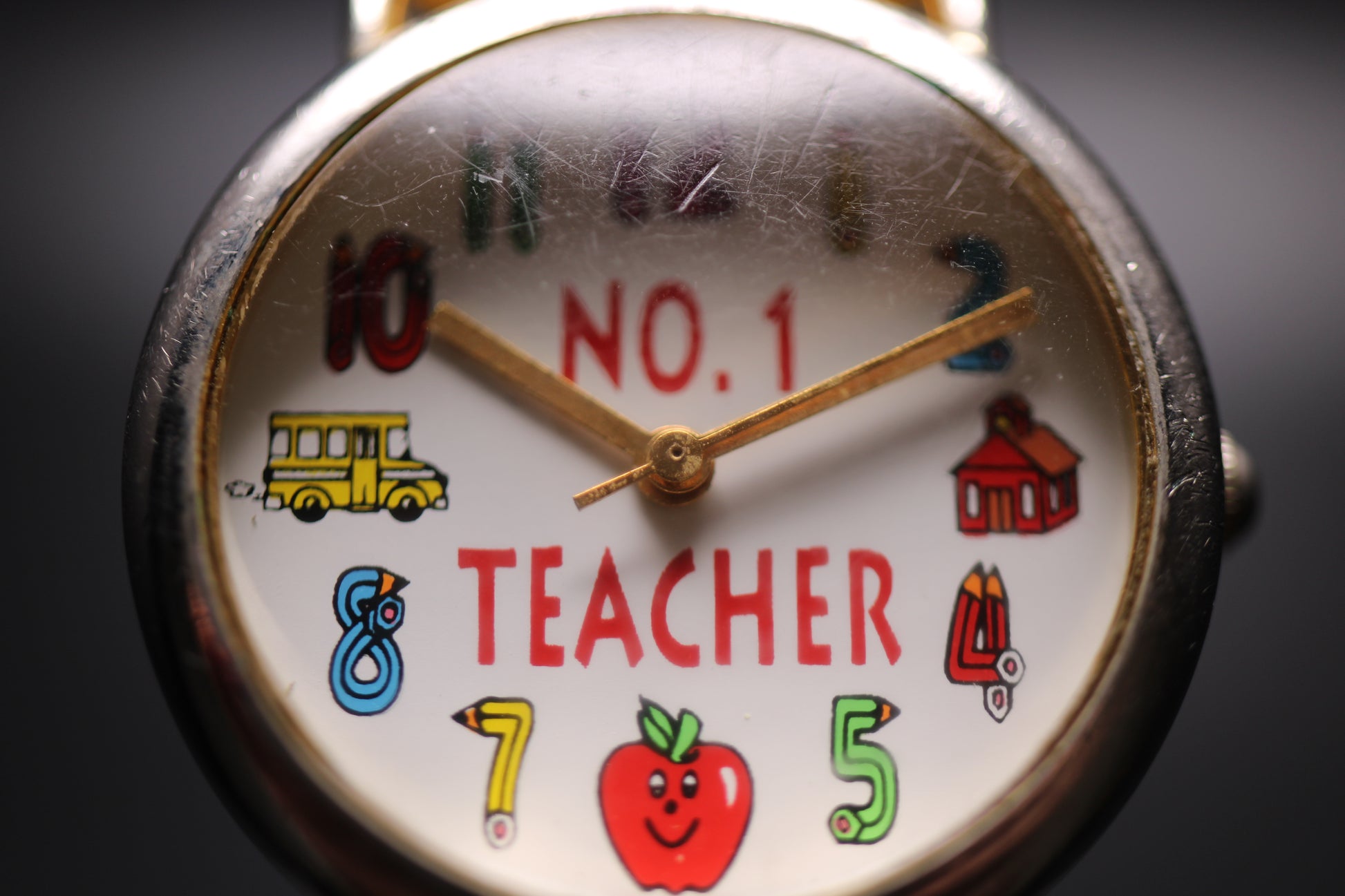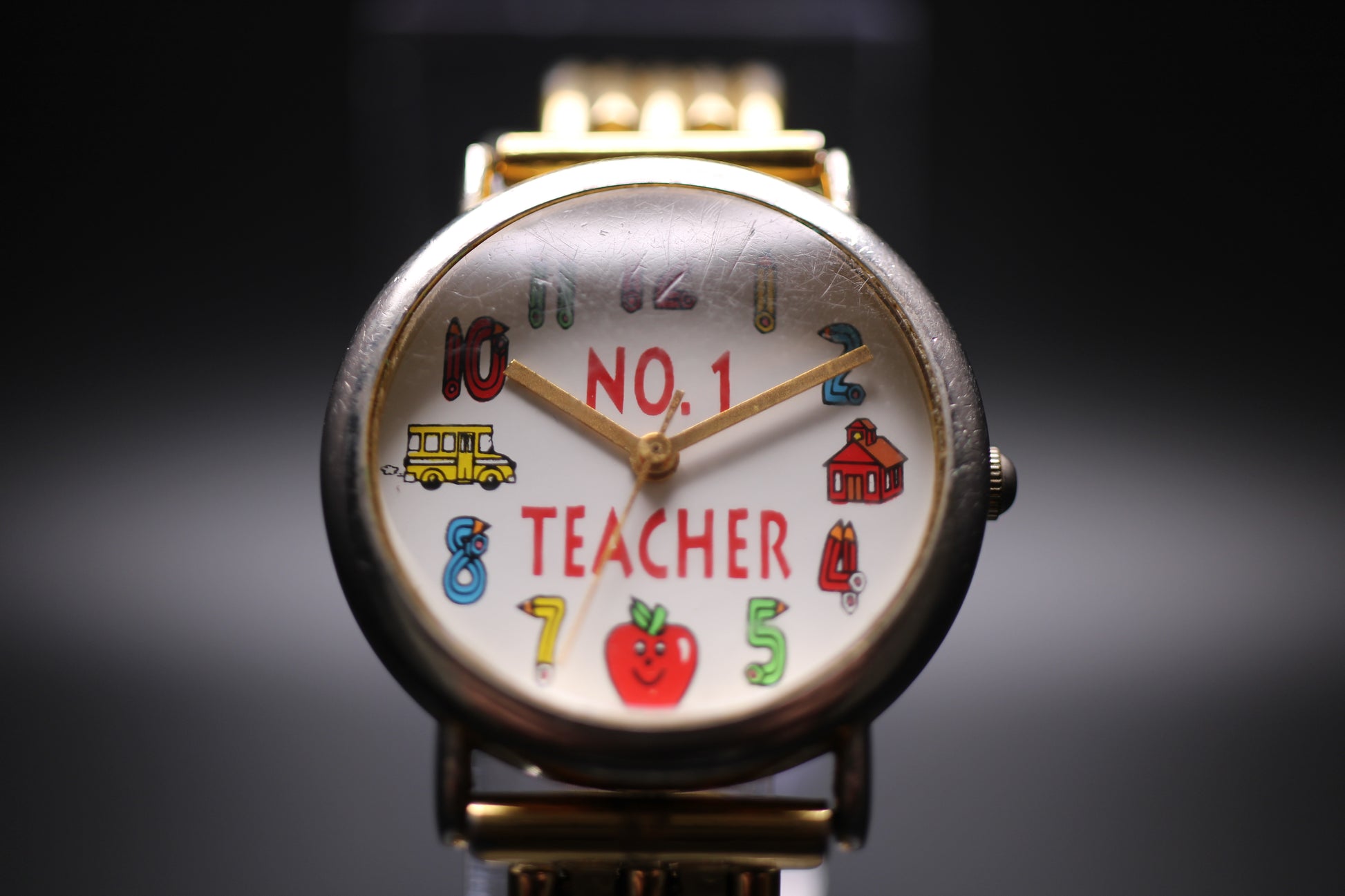 This whimsical vintage watch by DingBats celebrates the classic “#1 Teacher” theme, making it a charming collectible or nostalgic gift. The dial is full of colorful school-themed graphics: a cheerful red apple at six, a yellow school bus at nine, a red schoolhouse at three, and playful pencils, books, and cartoon-styled numerals filling out the rest. Large red “NO. 1 TEACHER” text dominates the center, giving it unmistakable character.