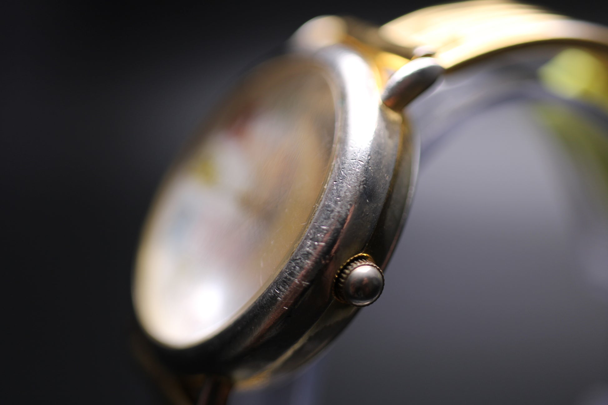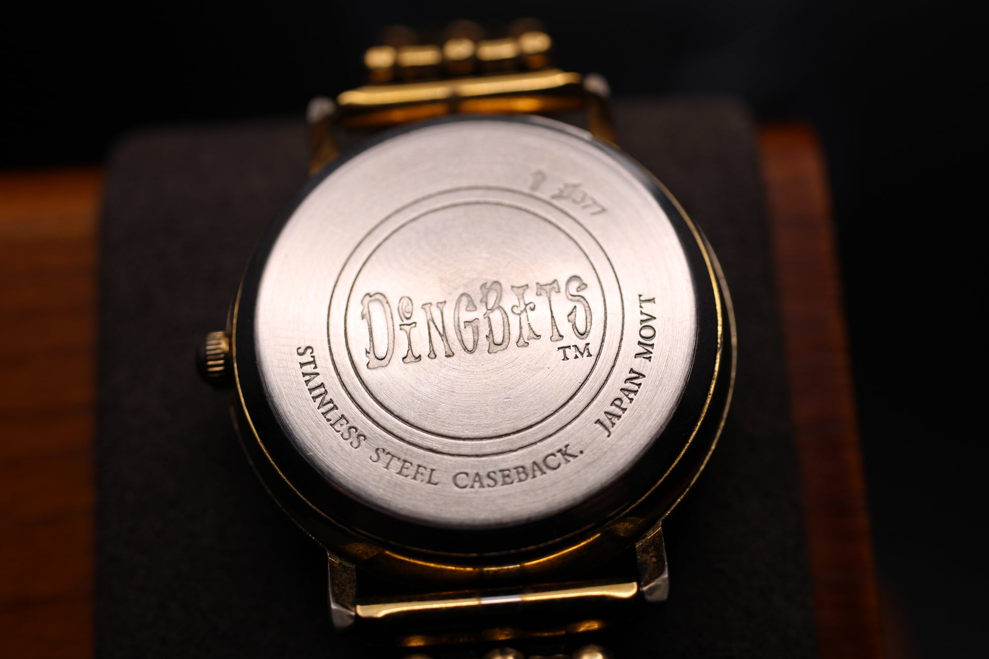 The watch runs on a reliable Japanese quartz movement, housed in a two-tone case with a stainless steel caseback engraved “DingBats.” It comes fitted with the original matching gold-tone bracelet, keeping the retro aesthetic intact.