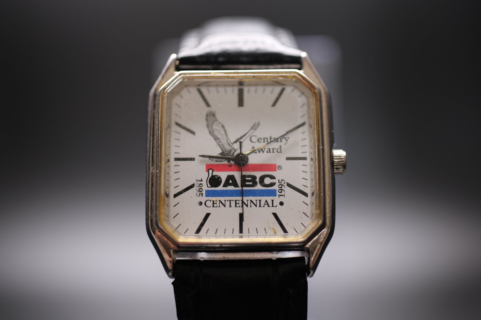 This ABC Bowling Centennial quartz tank watch is a quirky and rare commemorative timepiece, made to celebrate the 100-year anniversary of the American Bowling Congress. With its tank-style rectangular case and quartz movement, it bridges novelty, sport memorabilia, and late-20th century watch design in a way collectors love.