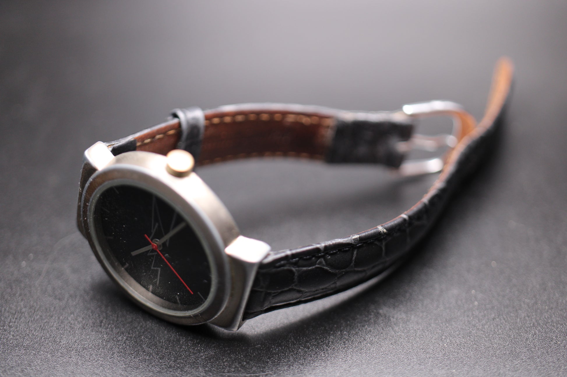 This is a 1996 Denver Art Museum Quartz Watch, created as a souvenir piece highlighting the museum’s celebrated architecture. The dial features a clean black background with minimalist stick indices and straight silver hands, accented by a bold red sweep second hand. At the center of the design is a white zig-zag motif — not random decoration, but a stylized outline of the Denver Art Museum building itself, a landmark known worldwide for its striking and unconventional architecture.